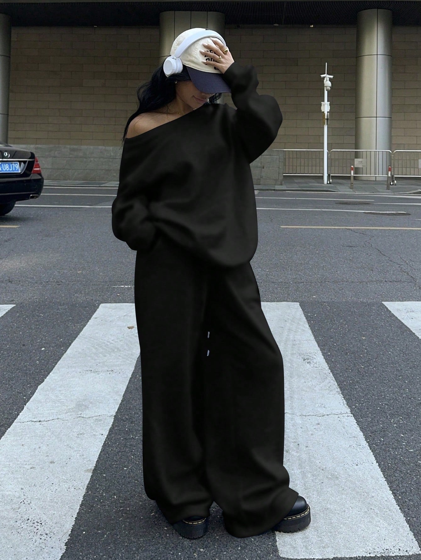 SXV 2pcs Women's Black Wide Neckline Off-Shoulder Loose Casual Sweatshirt And Wide Leg Sweatpants Set