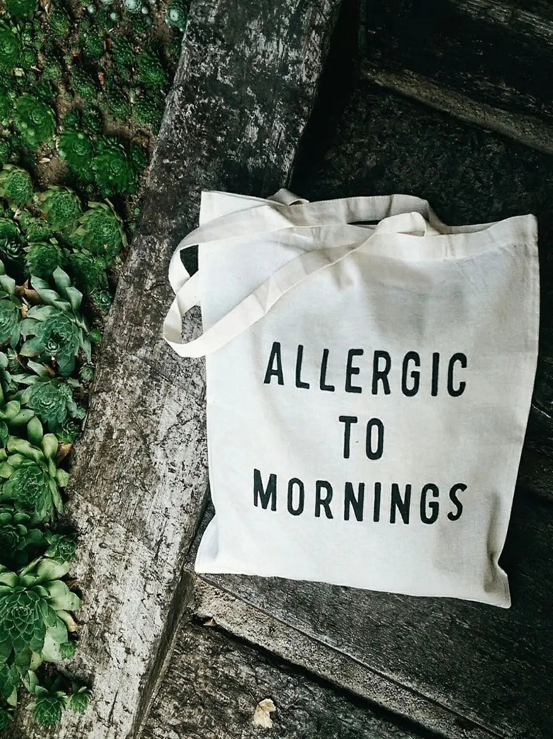 Large tote bag in canvas made from a cotton blend with a print "Allergic to mornings" on the front. Long two handles at the top.