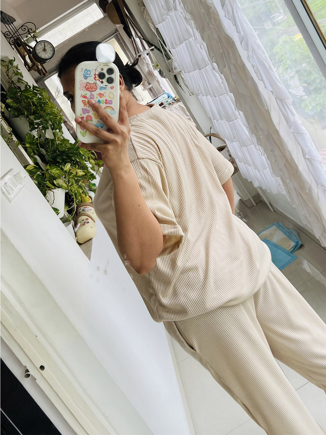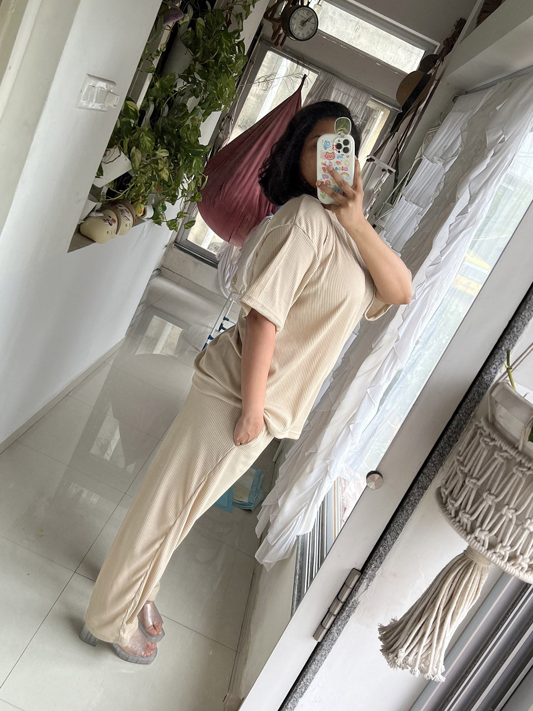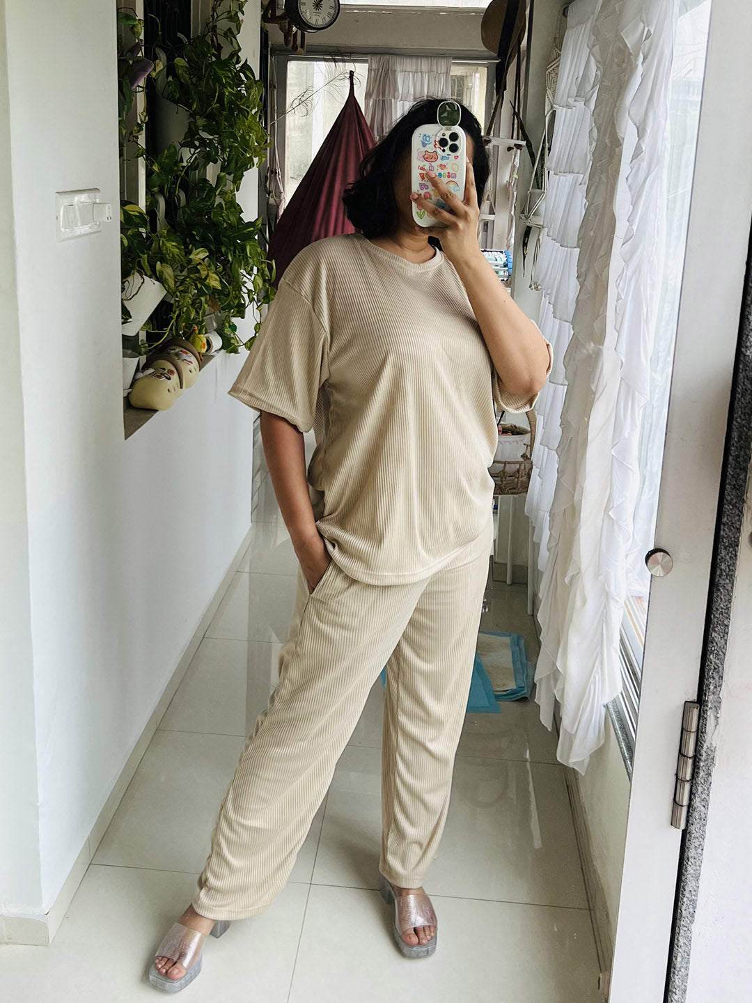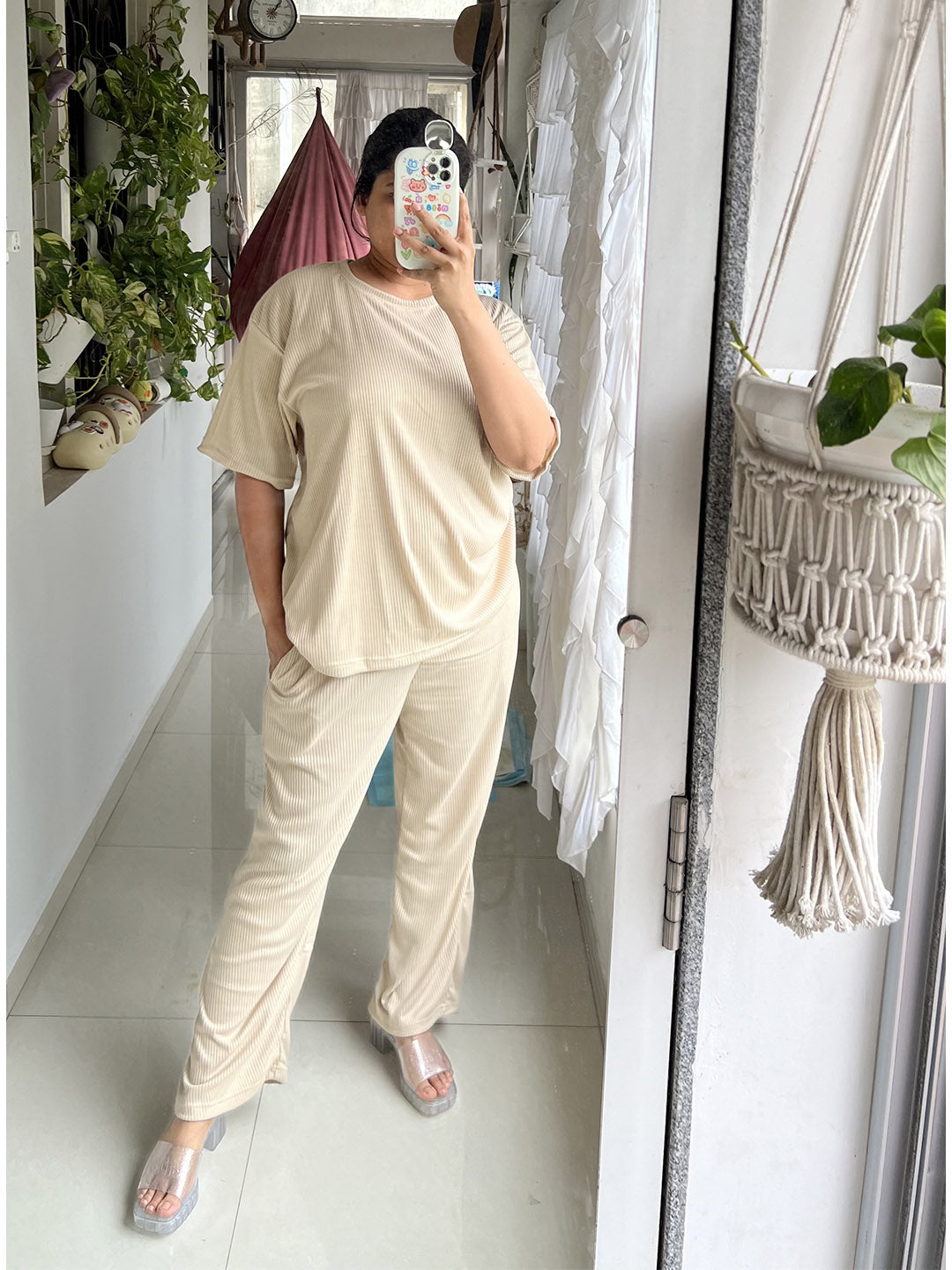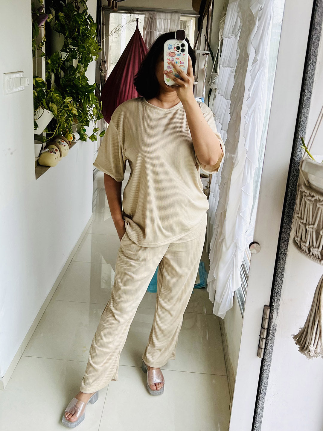SXV Basic CO-ORDS set : Beige Ribbed oversized t-shirt And Trouser Combo