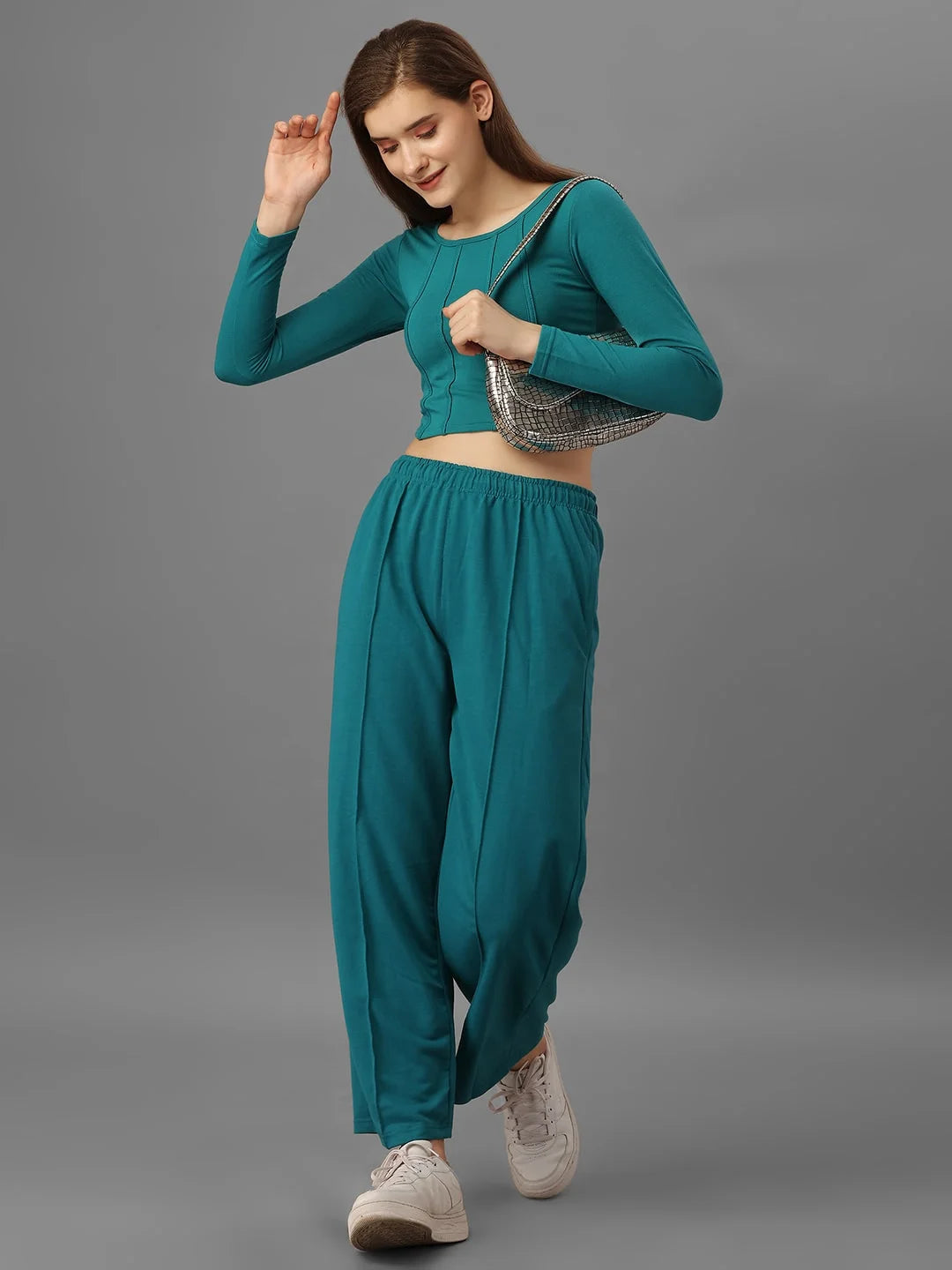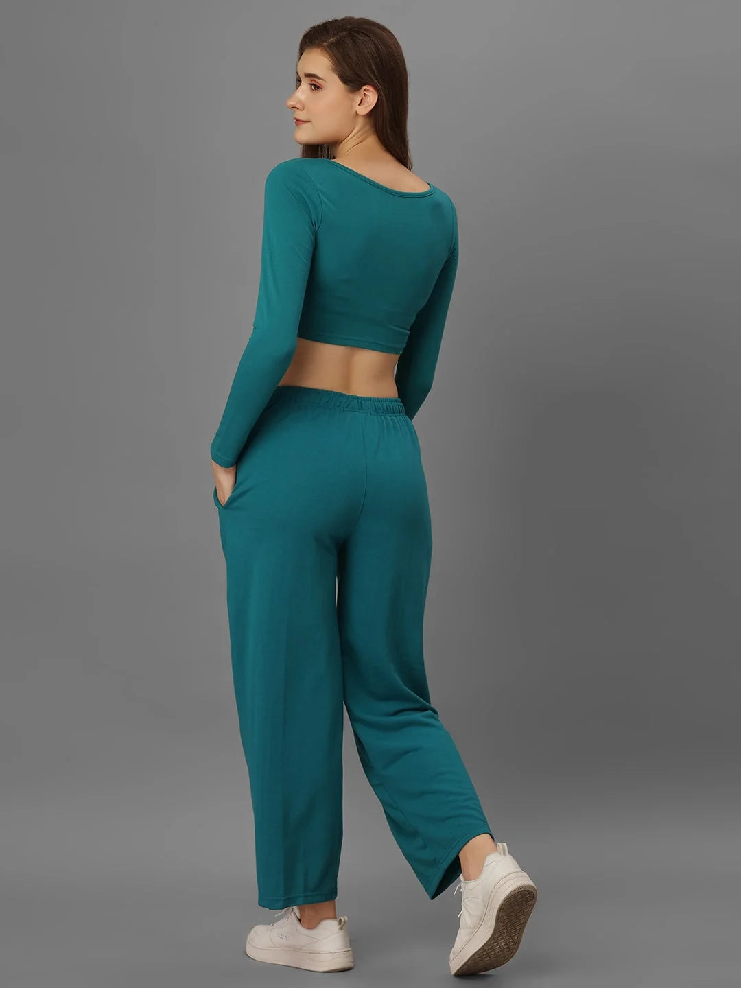 Tealgreen longsleeve Corset Croptop And Trouser Combo. A playful set made for those who don't take fashion too seriously. Featuring a quirky solid pattern in comfortable loopknit fabric ( 95% Polyester, 5% Elastane), this 2-piece outfit includes a crop top and high-rise trousers. Perfect for casual occasions, this combo is stretchy and easy to care for - just toss it in the wash! Designed with a round neck, full sleeves, and elastic closure (plus 2 pockets), this set is MADE IN INDIA for a touch of global style.