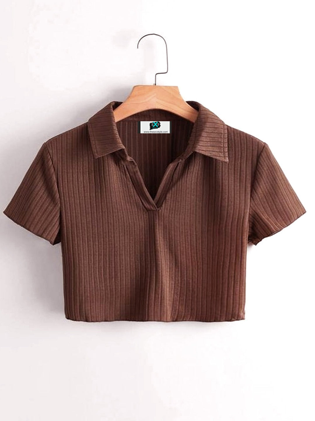 This ribbed polo collar crop t-shirt top is the perfect mix of sporty and chic. The brown color adds a touch of warmth, while the ribbed texture adds visual interest. Stand out from the crowd with this top that can be dressed up or down for any occasion.
