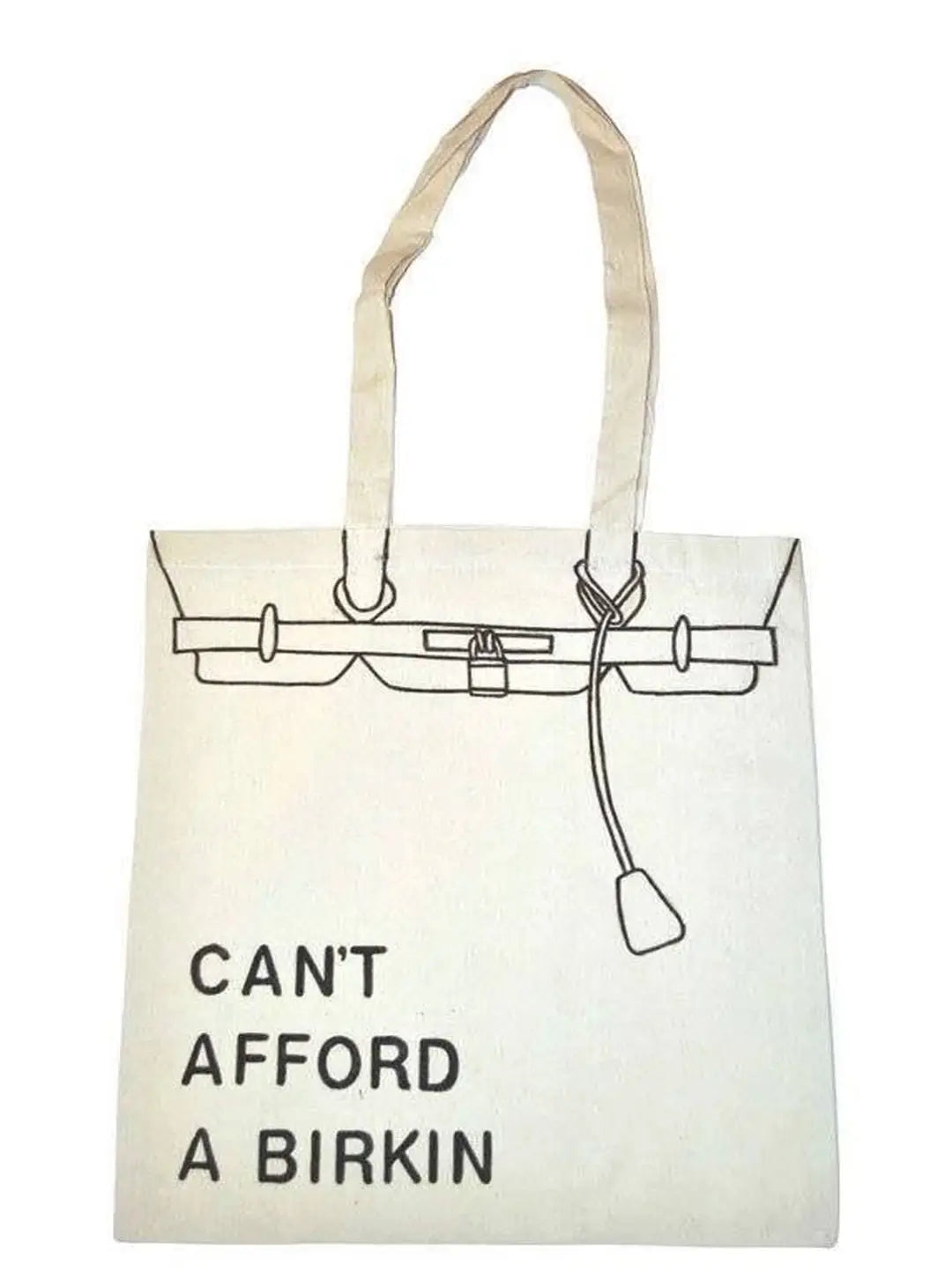 Large tote bag in canvas made from a cotton blend with a print "Cant afford a birkin" on the front. Long two handles at the top.