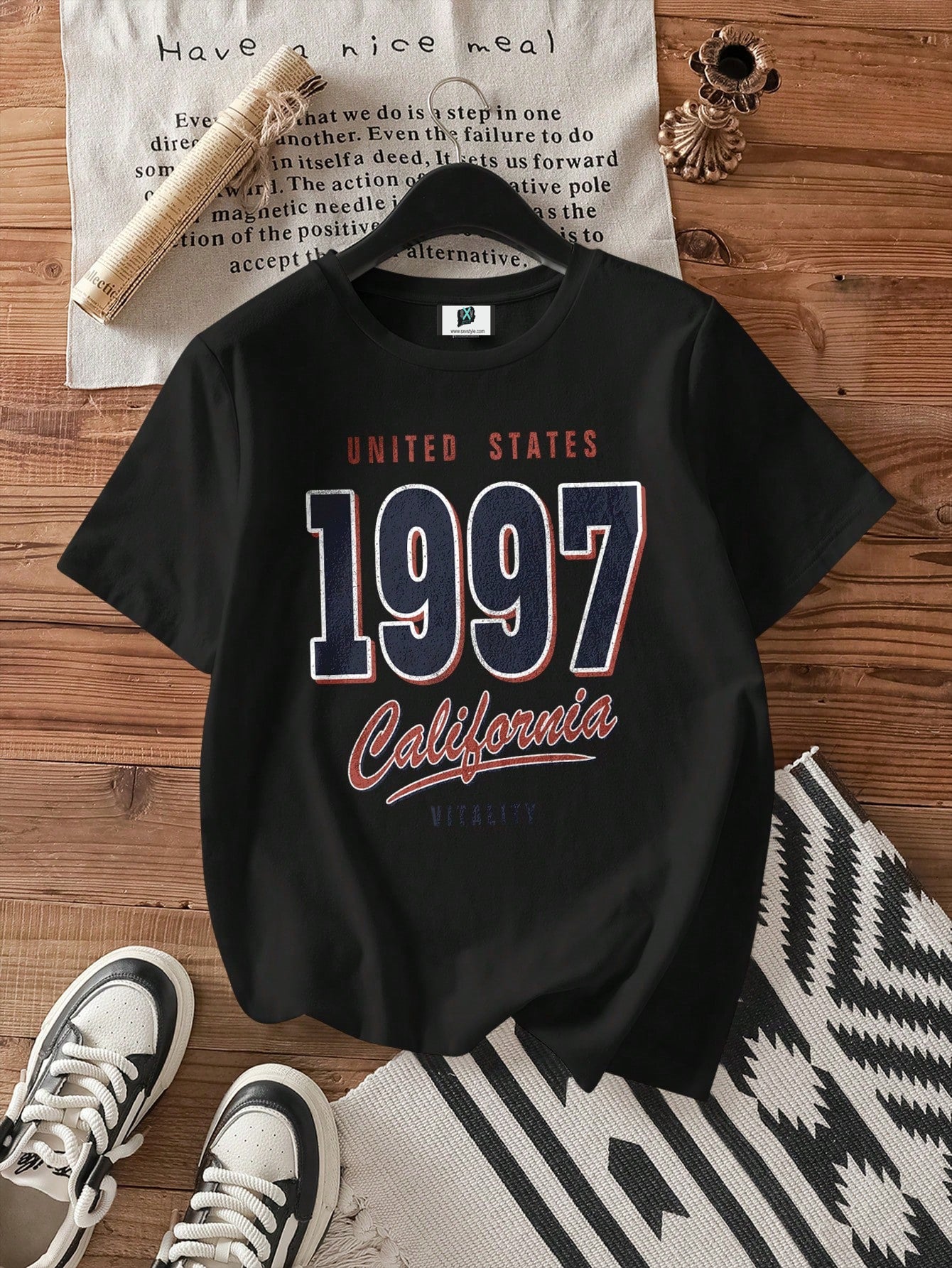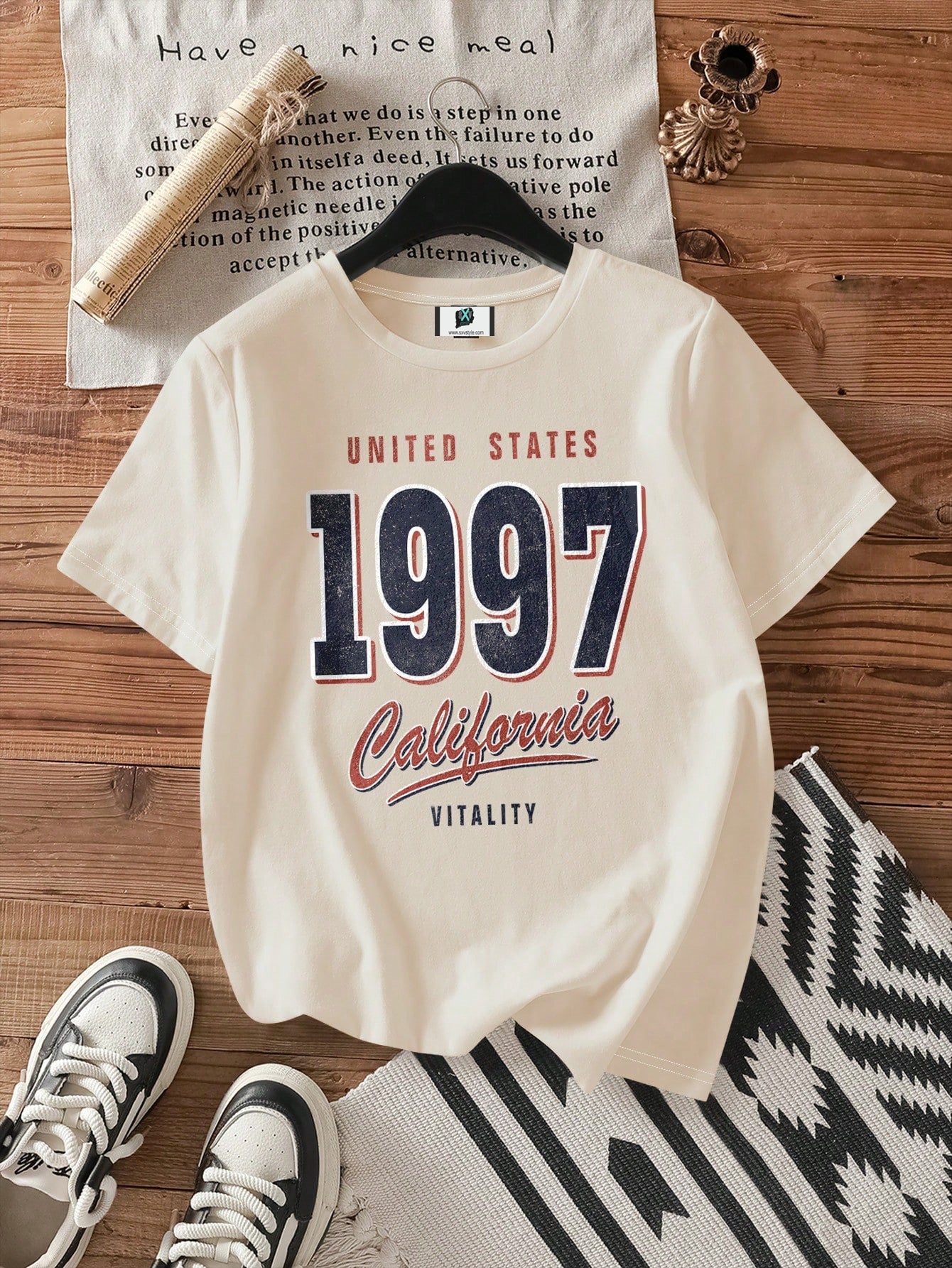 SXV Casual Minimalist 1997 Pattern Round Neck Short Sleeve Loose Women T-Shirt, Cotton Blend, Suitable For Summer