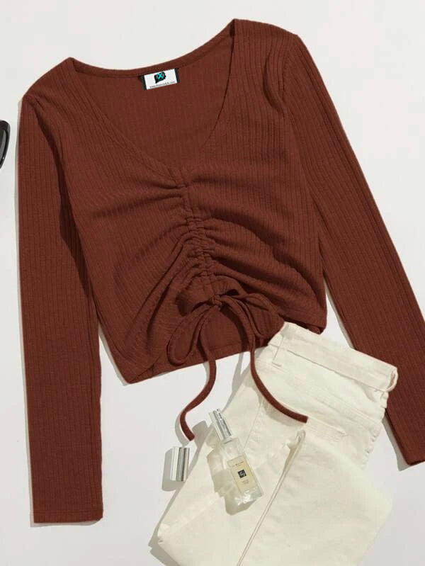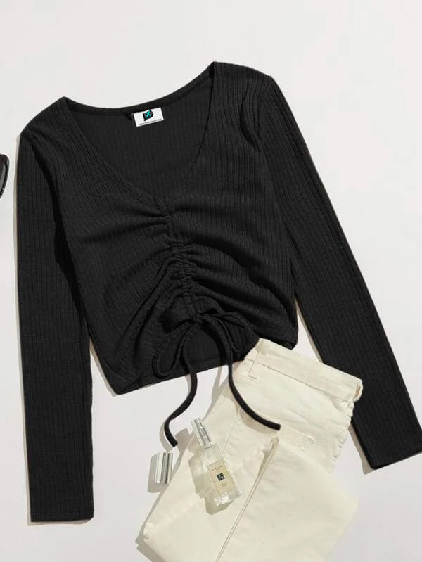 SXV Front Drawstring Rib Knit Full sleeves Top