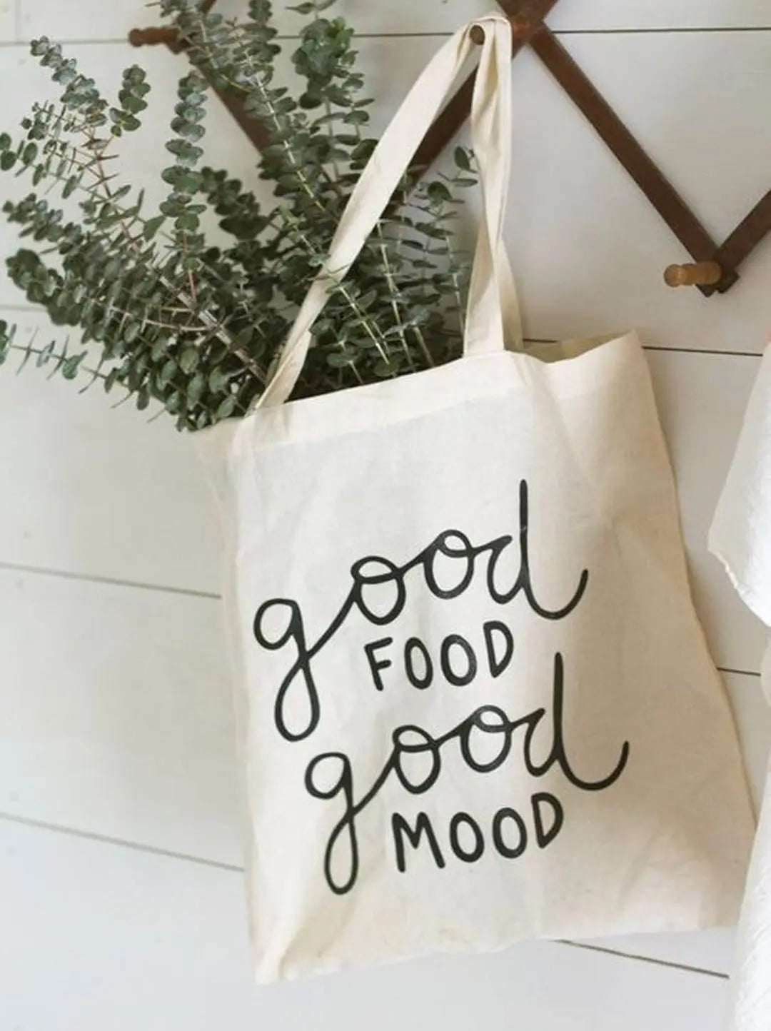 Large tote bag in canvas made from a cotton blend with a print "Good food good mood" on the front. Long two handles at the top.