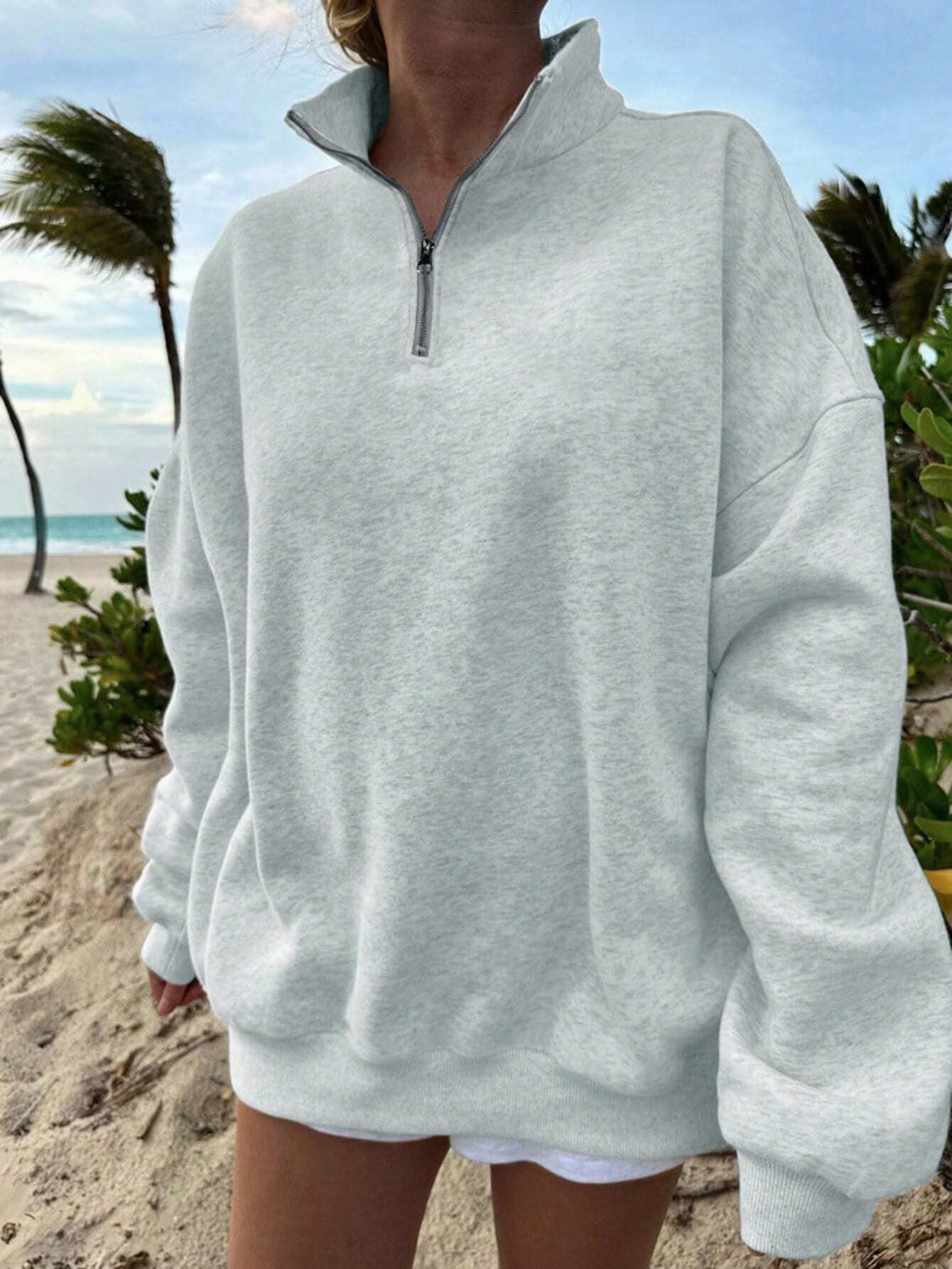 SXV Half zip Solid Color Drop Shoulder White Sweatshirt