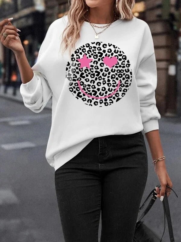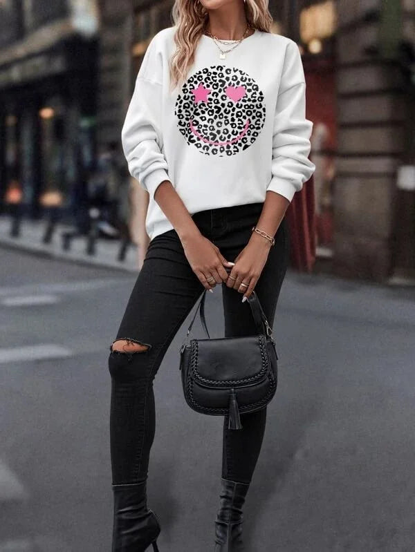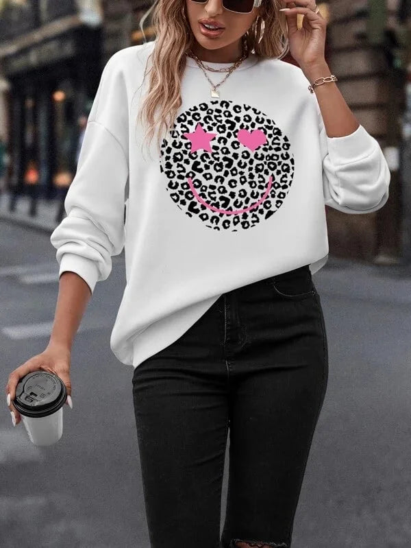 SXV 'Leopard Print Smile’ Printed Cool Aesthetic Drop Shoulder Oversized Sweatshirt