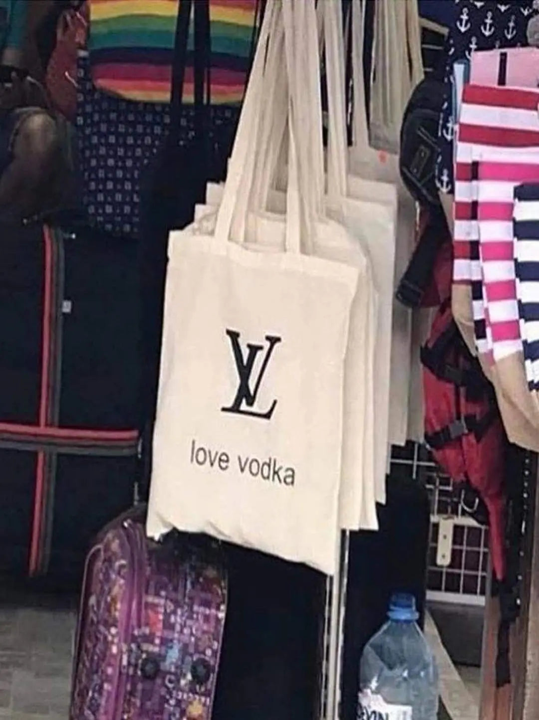 Large tote bag in canvas made from a cotton blend with a print "love vodka" on the front. Long two handles at the top.