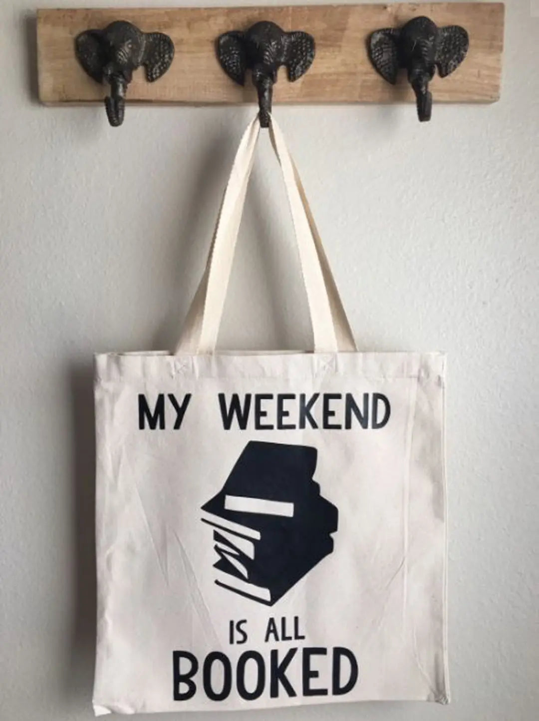 Large tote bag in canvas made from a cotton blend with a print "My weekennd is all booked" on the front. Long two handles at the top.