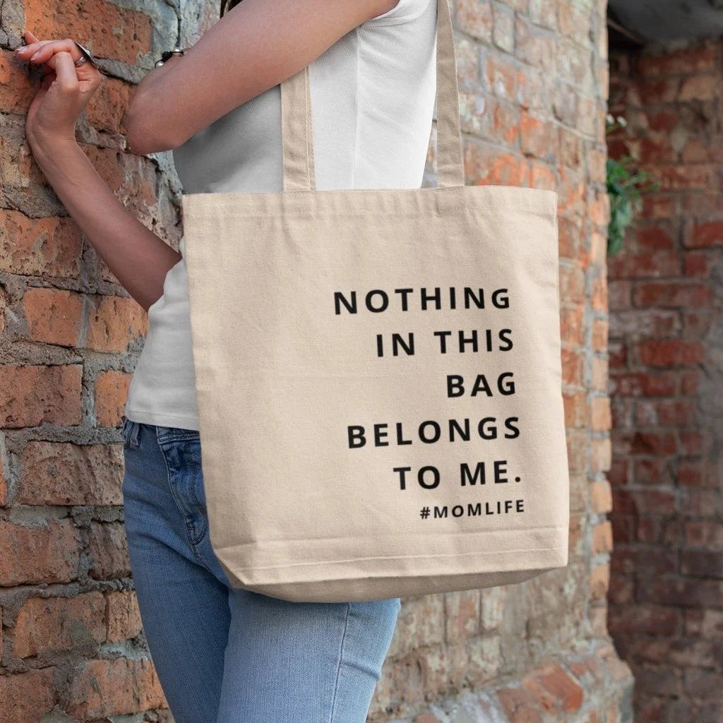 Large tote bag in canvas made from a cotton blend with a print "NOTHING IN THIS BAG" on the front. Long two handles at the top.