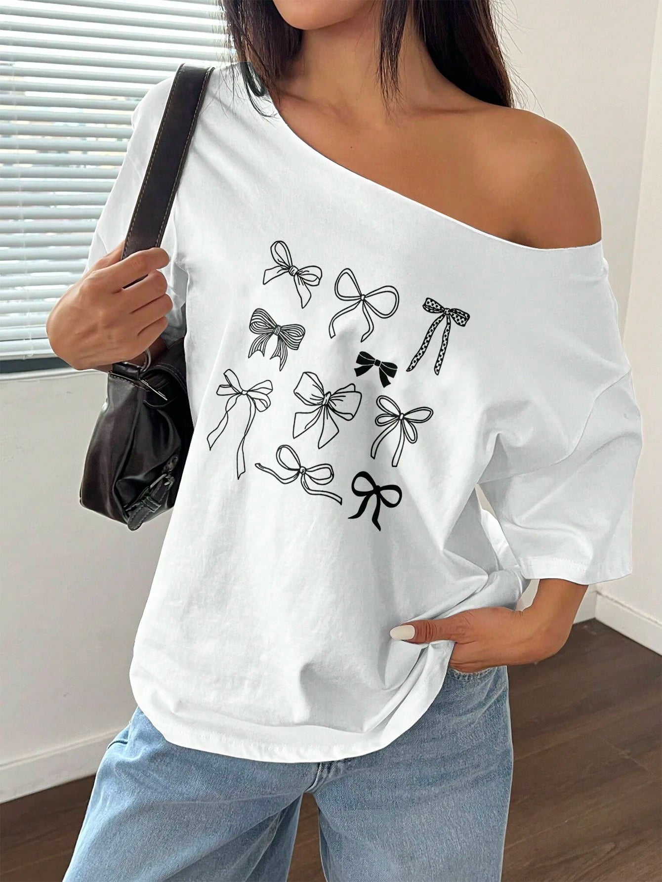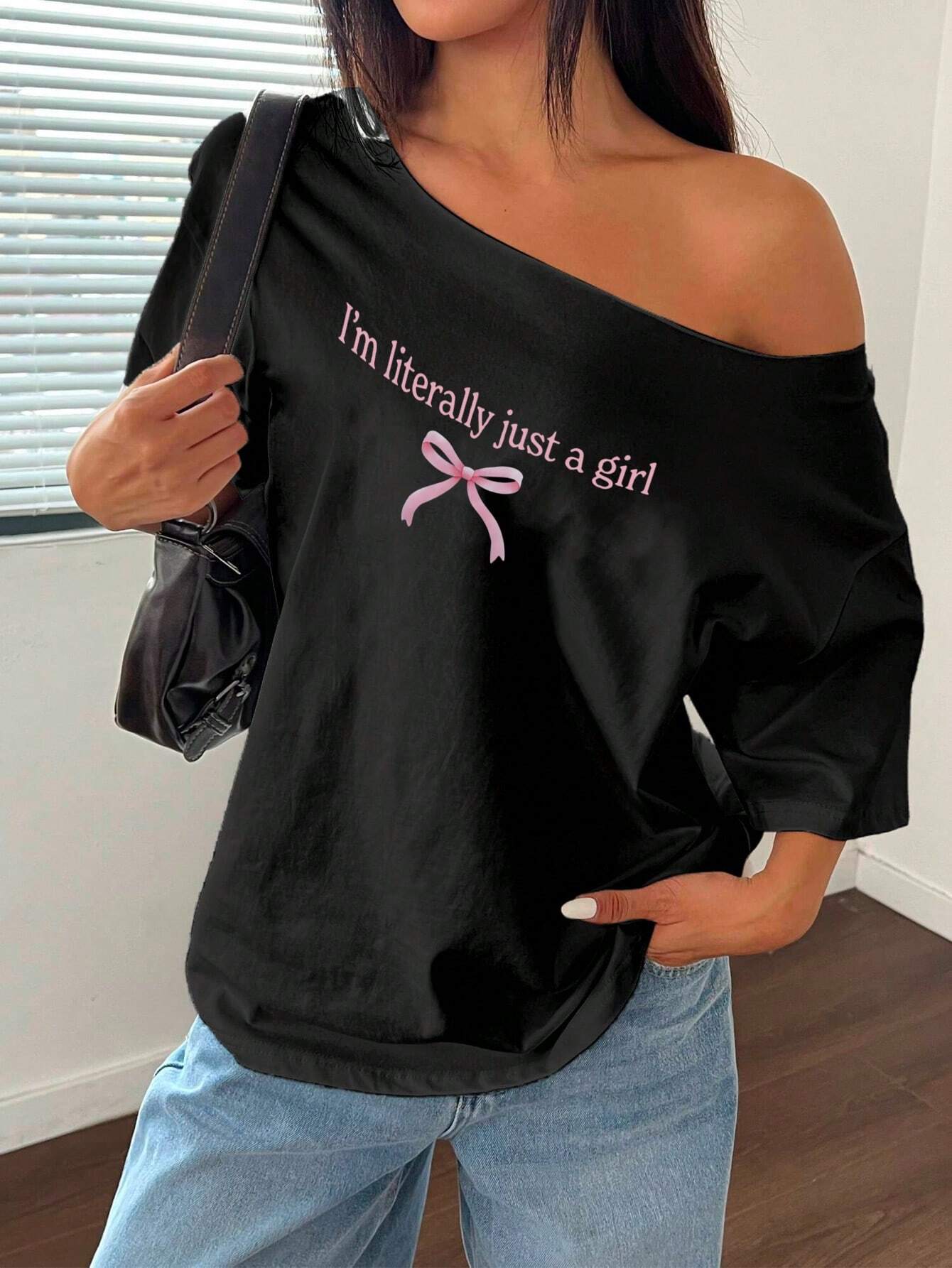 SXV Off-Shoulder Loose Slogan & Butterfly Detail T-Shirt, Oversized Y2K Style, Pink Graphic Tees Women