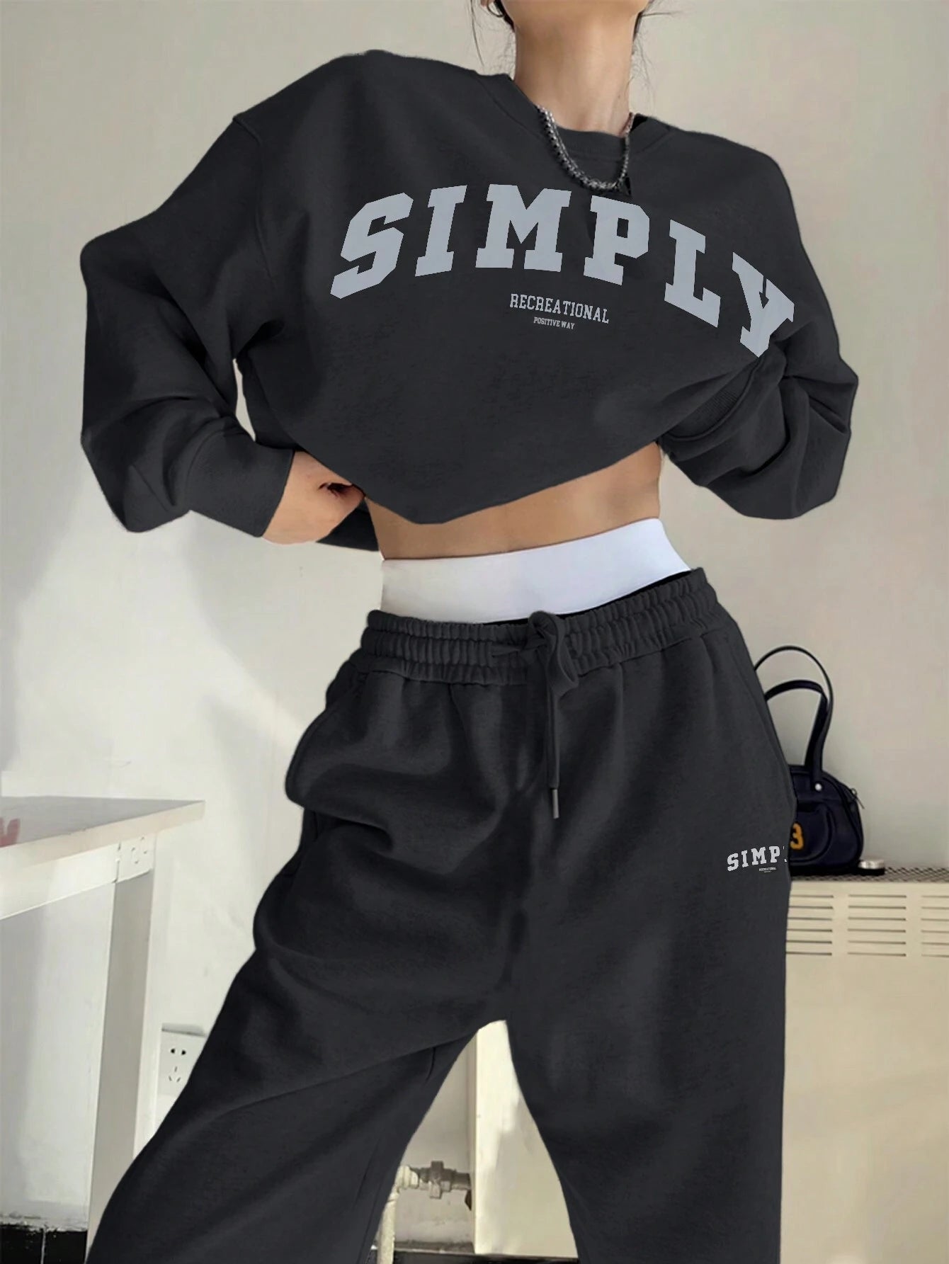 SXV Set Women Solid Color Fleece Crew Neck Hoodie And Letter Print Sweatshirt