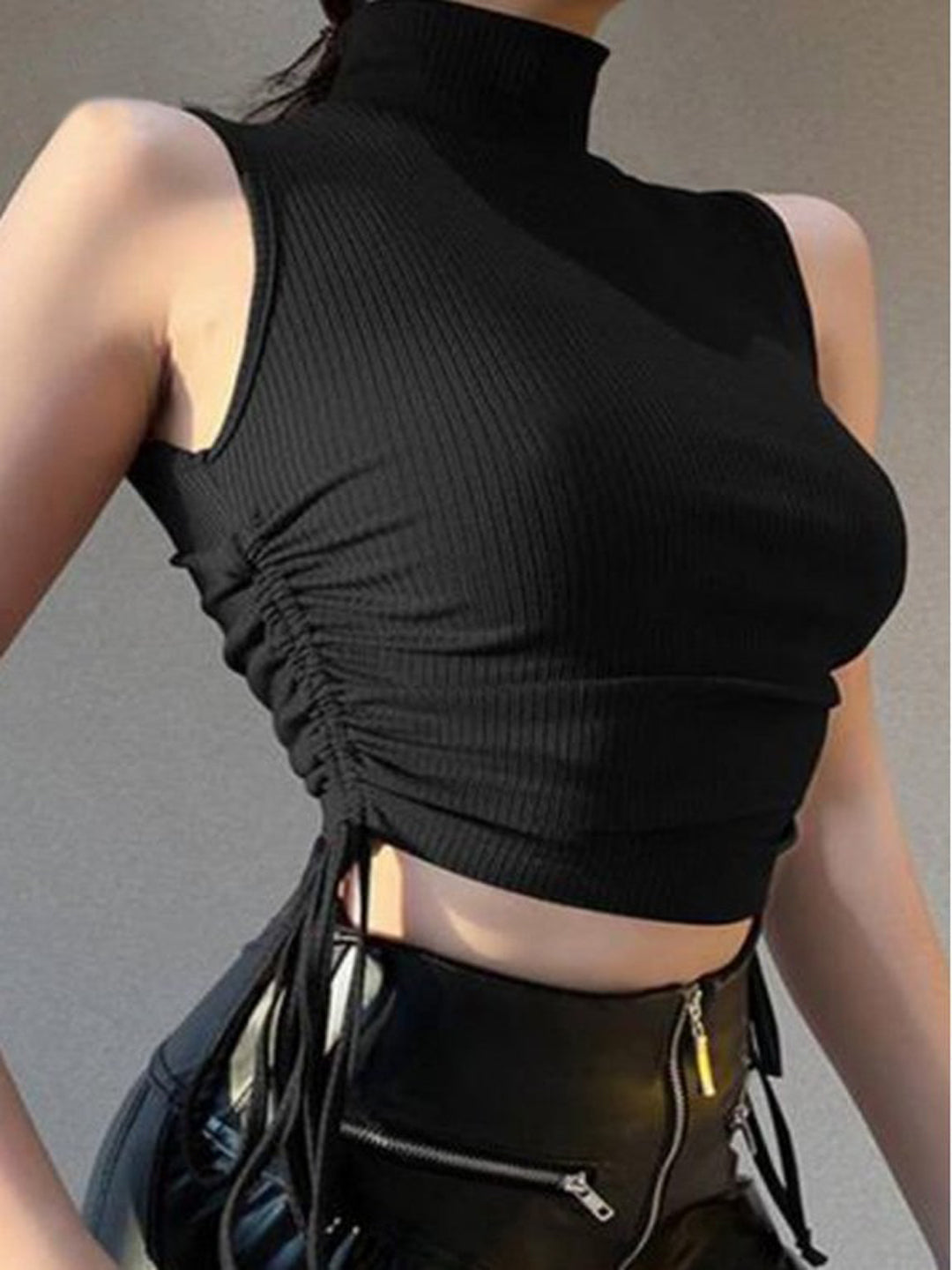 Elevate your style with the SXV Solid Black Highneck Ribbed Drawstring Crop Top. Its sleek ribbed texture and adjustable drawstring add a fun twist to a classic highneck design. Perfect for mixing and matching, this crop top brings a playful edge to any outfit while keeping you comfy and confident all day long.