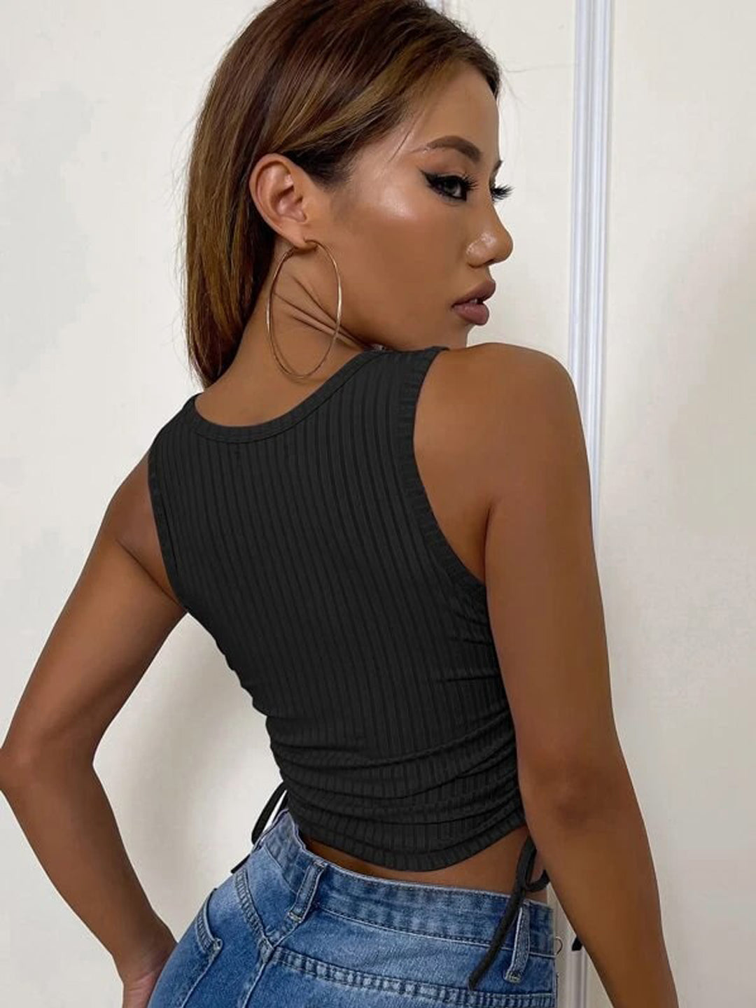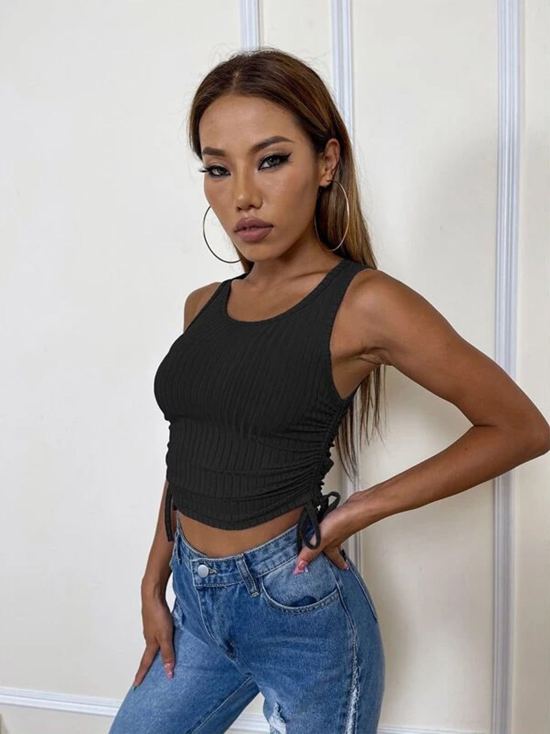 SXV Solid Black Roundneck Sleeveless Drawstring Ribbed Crop Top