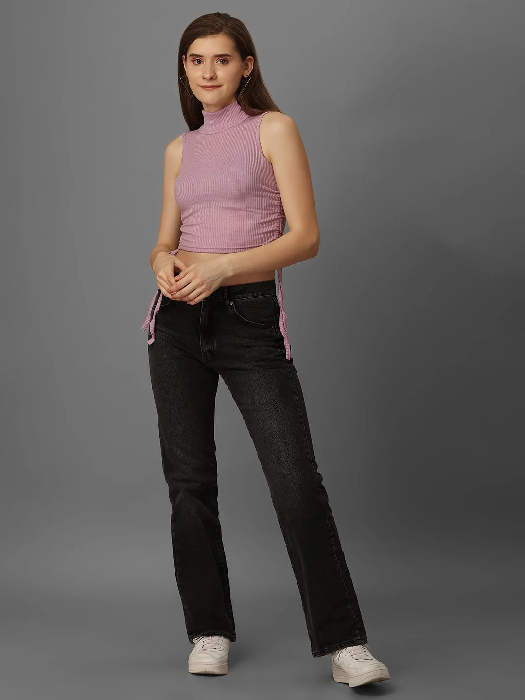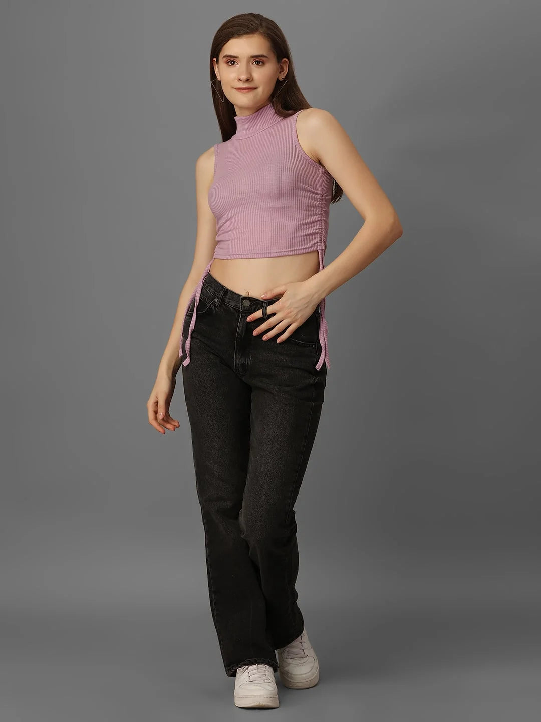 Get ready to turn heads with our SXV Solid Lavender Highneck Ribbed Drawstring Crop Top! Made with stretchy ribbed material, this slim fit top is perfect for any casual occasion. The highneck and sleeveless design, along with a playful drawstring decoration, adds a touch of personality to this new basic. Made in India for quality you can trust.