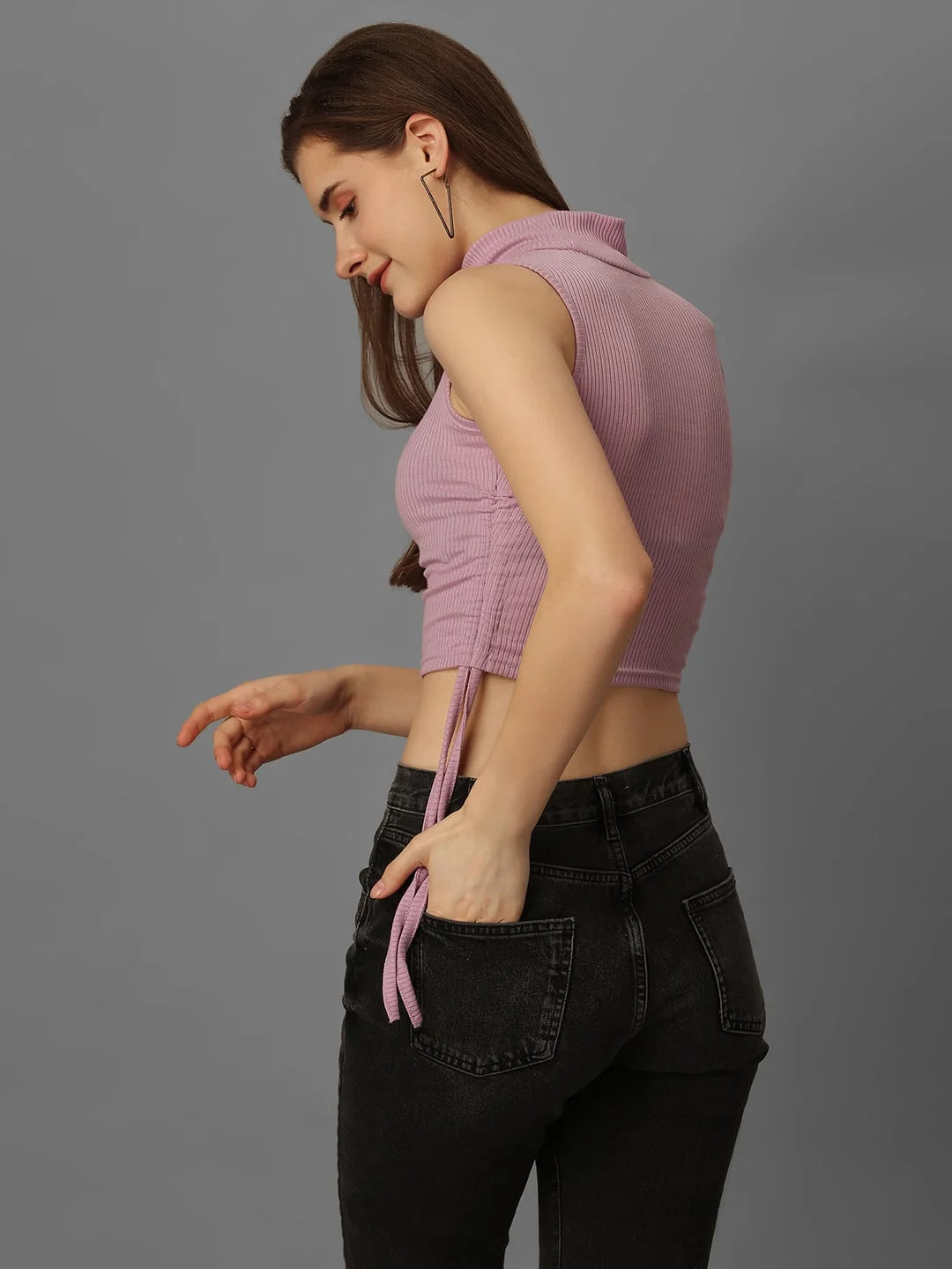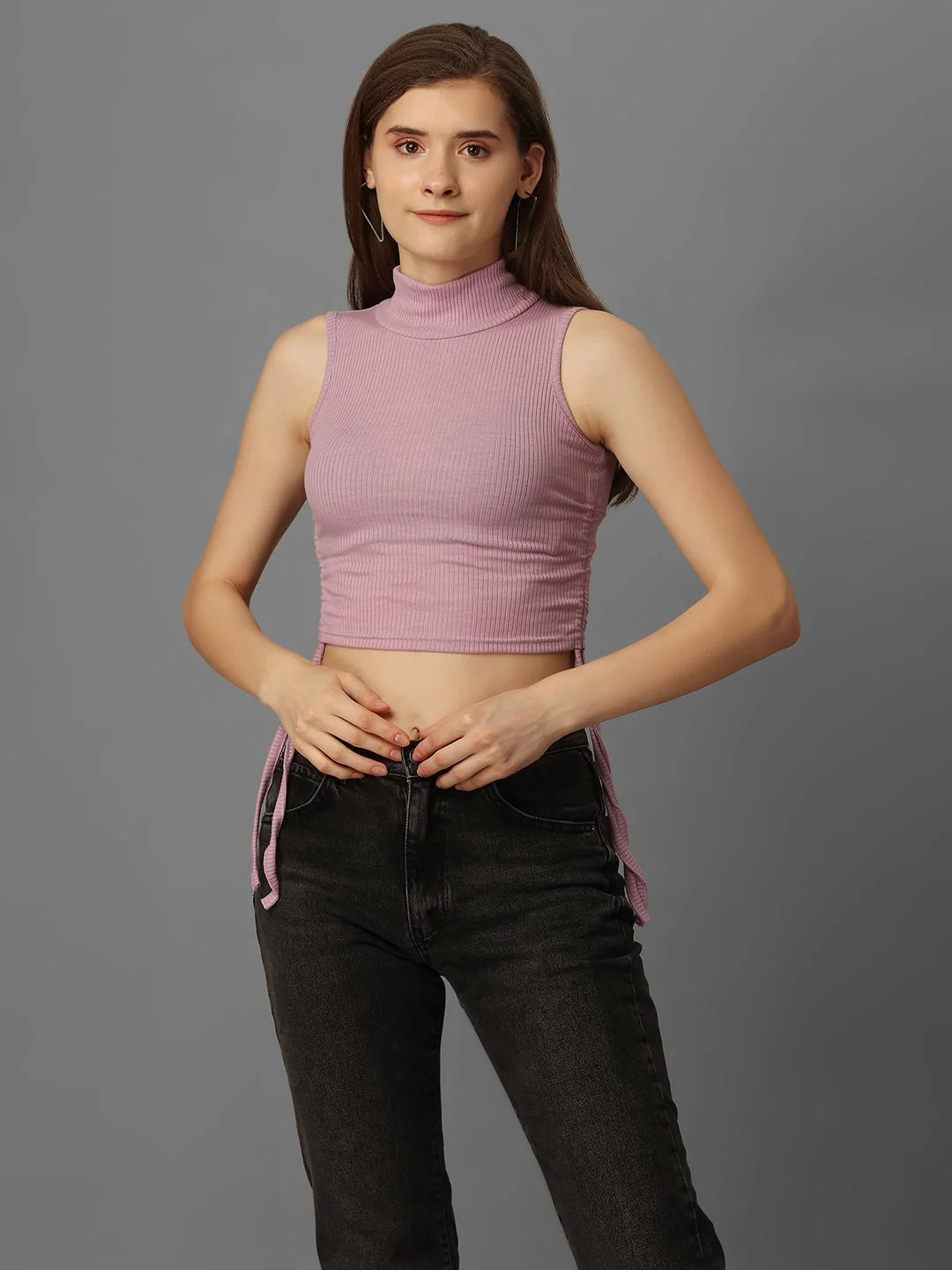 SXV Solid Lavender Highneck Ribbed Drawstring Crop Top