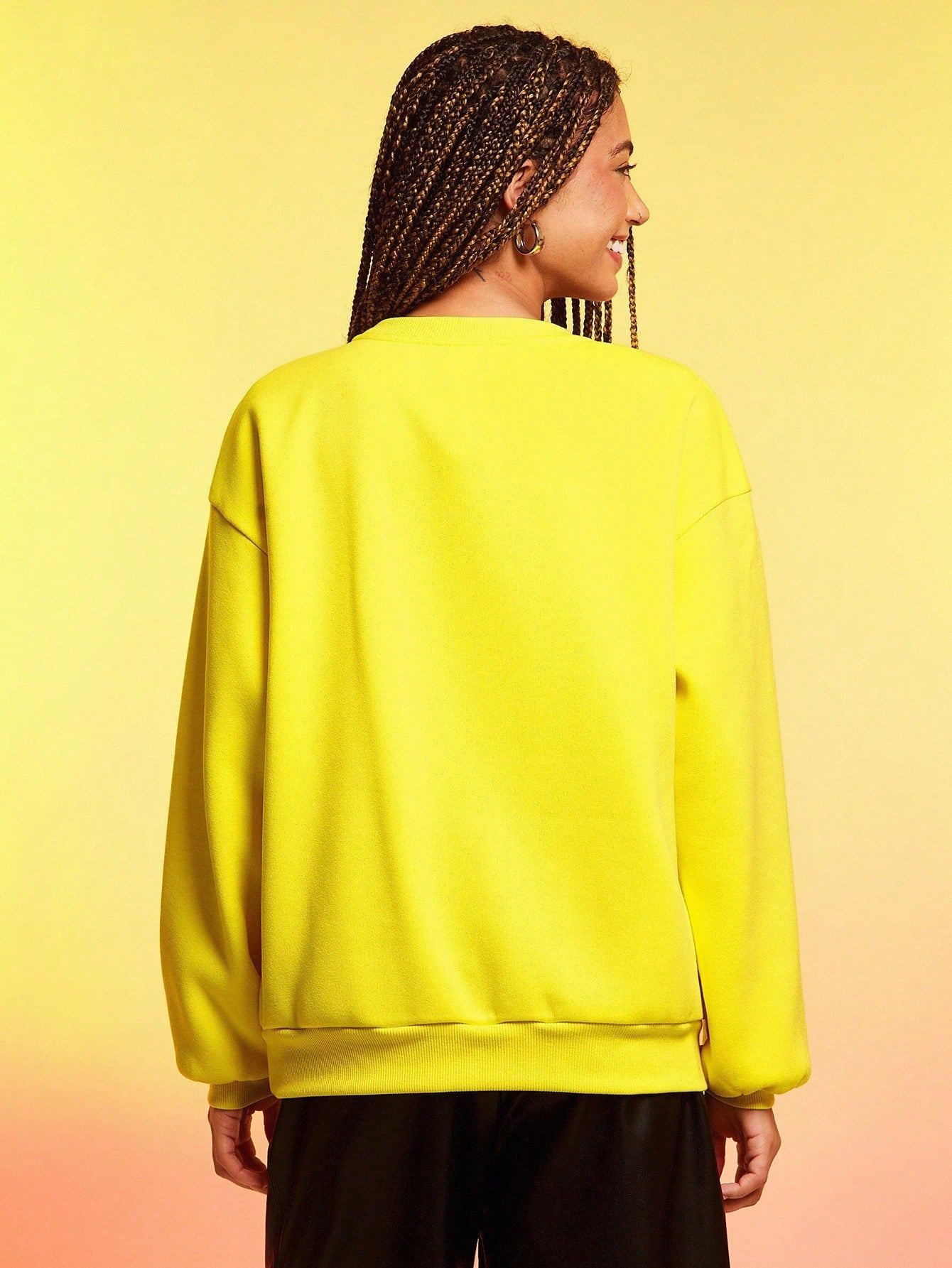 SXV Women Cute Cartoon Face Print Drop Shoulder Loose Crew Neck Long Sleeves Fleece Sweatshirt