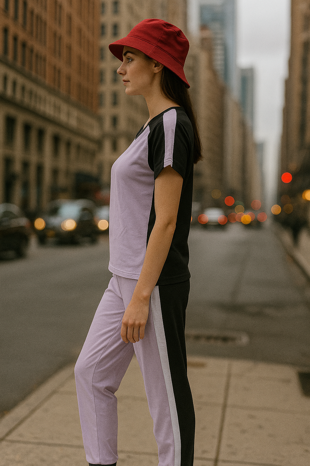 Get ready to move in style with this fabulous lilac tracksuit set! The soft cotton blend keeps you comfy whether you're hitting the gym, running errands, or just vibing at home. The short-sleeve top pairs perfectly with matching joggers, while the sleek black trim adds that extra edge. Designed for plus-size figures with a flattering fit that celebrates your curves. Effortless, chic, and totally you—because athletic wear should make you feel amazing!