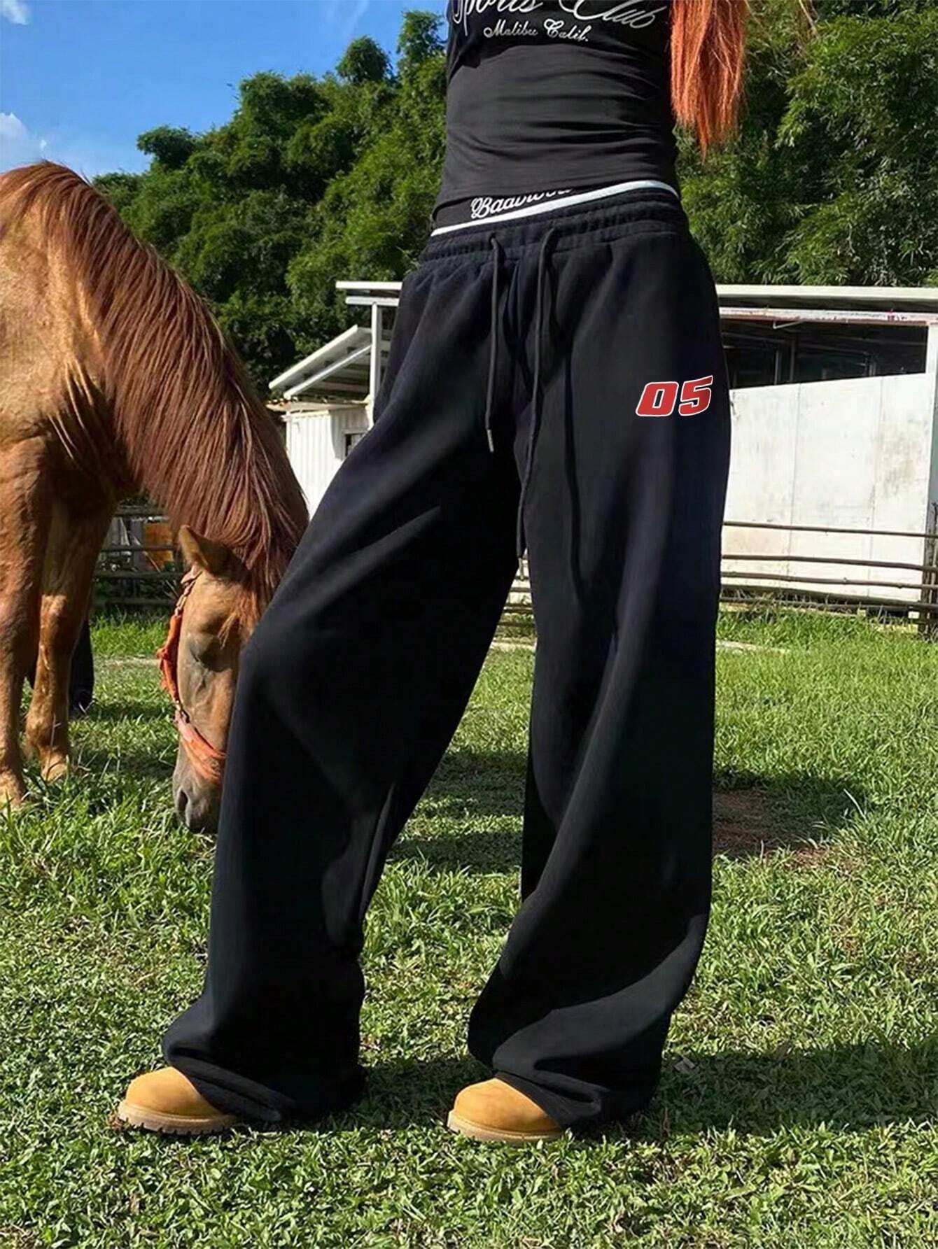 Stay comfy and stylish in our SXV Women's Sweatpants. These wide leg, relaxed fit sweatpants feature a drawstring waist for a personalized fit. The black pants are accented with playful letter print, adding a touch of fun to your casual look. Perfect for lounging or running errands.